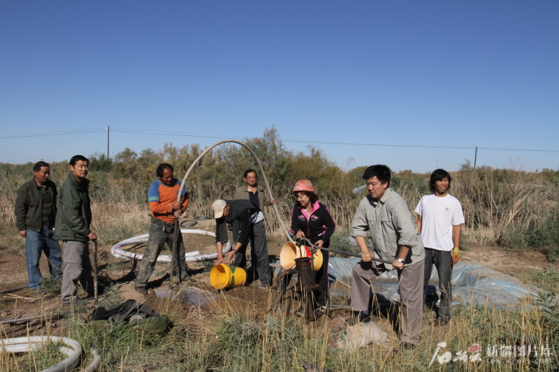 陈亚宁(前排右一)在塔里木河流域生态样地进行地下水监测井建设。图片由本人提供