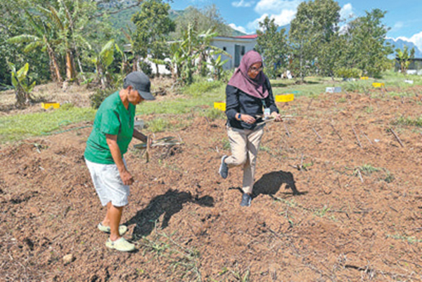赫新(右)在指导乌尼瓦卡种植巨菌草。 本报记者 陈效卫摄