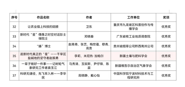 近日,中国科协公布了2023年“科学也偶像”短视频征集活动获奖名单,其中,新疆土壤与肥料学会报送的《追新时代真正的“星”--干旱区盐碱地的坚守者赵振勇》获优秀奖。