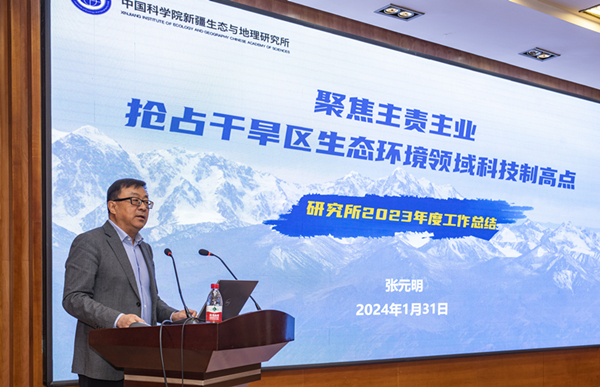新疆生地所所长张元明作了题为《聚焦主责主业 抢占干旱区生态环境领域科技制高点》的报告,从2023年度重点工作进展、存在的突出问题和2024年工作思路及重点举措等三个方面,全面总结了研究所2023年主要工作成绩与2024年重点规划。他指出,研究所在2023年以国家战略需求为导向,持续凝练干旱区生态资源环境领域的重大科学问题,积极牵头承担科技重大任务,加大人才培养引进力度,开拓“一带一路”国际合作,创新组织模式,统筹调配优势力量,树牢抢占科技制高点意识,聚焦主责主业,全面完成本年度各项任务,重点工作实现新突破,各项任务迈上新台阶。