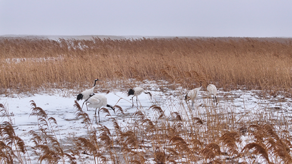 赵亚杰:有近海与海岸湿地、河流湿地、沼泽湿地、人工湿地共4类12型,像淤泥质海滩、浅海水域、草本沼泽湿地的面积是最大的,这也为迁徙的鸟类提供了很好的觅食地、繁殖地和越冬地。2023至2024年迁徙和越冬季,我们加强了丹顶鹤、灰鹤这类珍稀水鸟的种群数量与分布动态监测。2023年11月迁徙期,我们共监测到鹤类有5种8698只,2024年1月份,我们也开展了越冬鹤类的同步调查,监测到了5种,一共是5267只,包括像丹顶鹤、灰鹤、白枕鹤、白鹤和白头鹤。