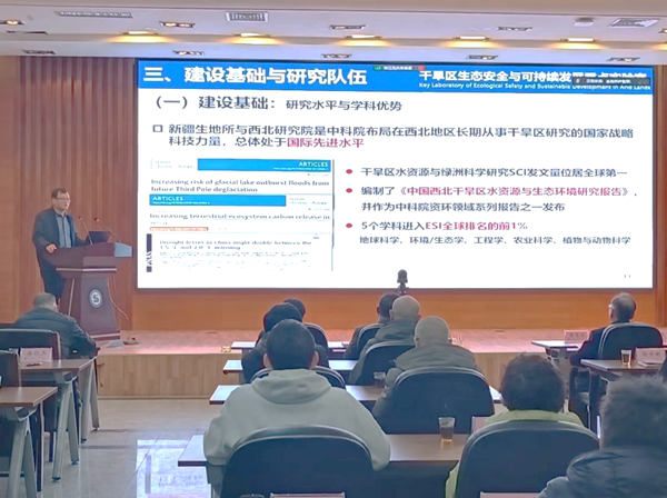 周晓兵宣读了中国科学院关于批准建设“干旱区生态安全与可持续发展重点实验室”的通知,并介绍了重点实验室重组背景和目前建设情况,从战略意义与使命定位、发展目标与方向任务、建设基础与研究队伍、重组举措与体制机制、建设期各项工作进展五个方面进行了汇报,并明确下一步工作目标和任务。